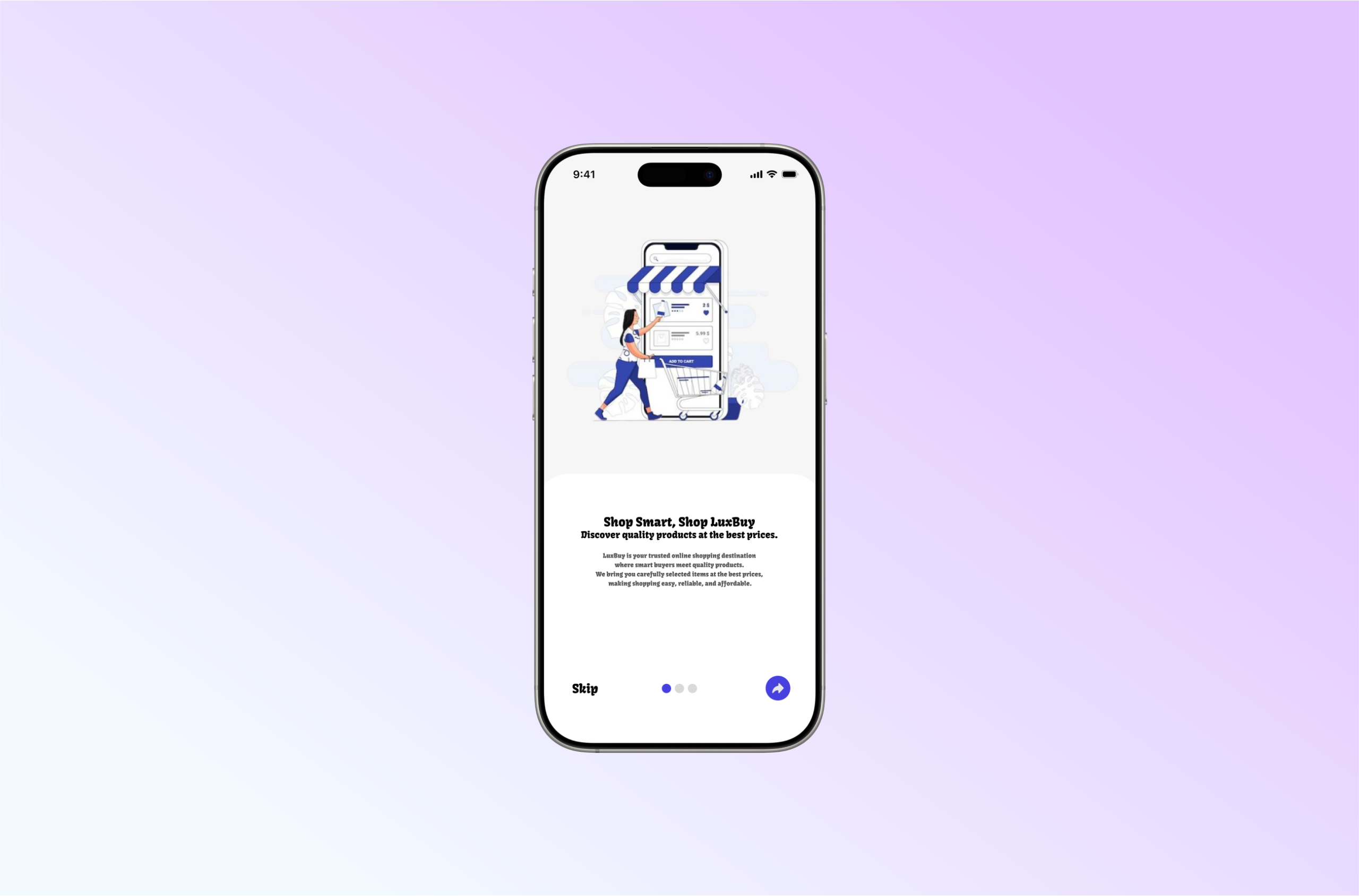 For LuxBuy, the onboarding screens were designed to be simple, minimal, and easy to skim, with readable typography and balanced spacing. The focus was on introducing value before asking the user to register.