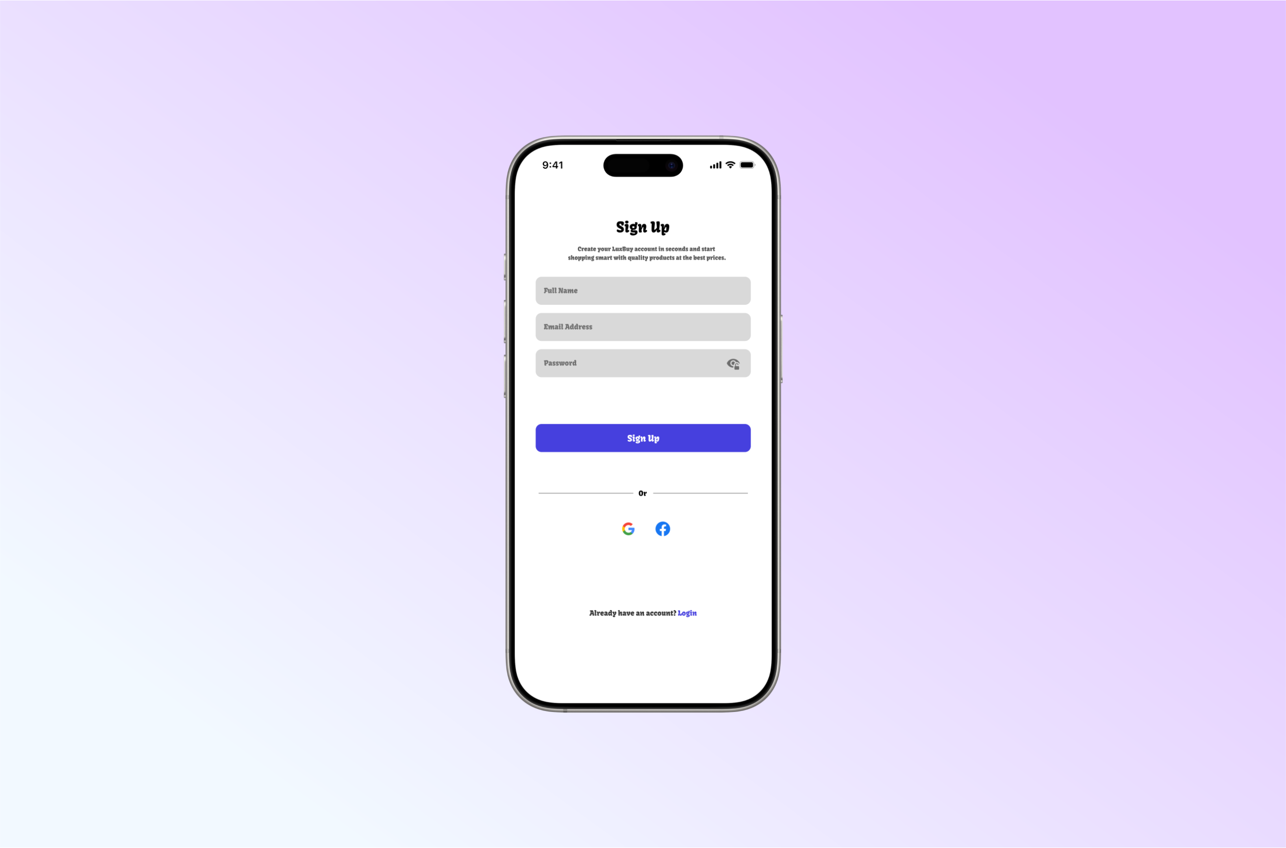 In the LuxBuy sign-up screen, the layout is structured to feel effortless. The user should not need to “study” the screen to know what to do.